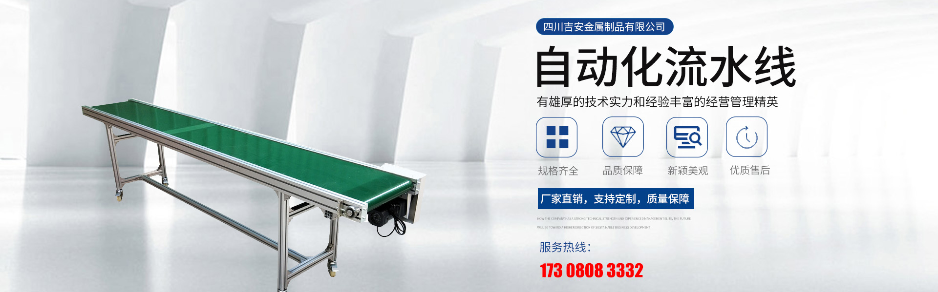 四川吉安金屬制品有限公司是集工業鋁型材及配件、貨架、工作臺、皮帶輸送線、自動化流水線、線棒精益管及扣件、鈑金和鋁合金流利條、鋁線棒及扣件、倉儲設備、物流器具、周轉臺車、工位器具、非標器具設...